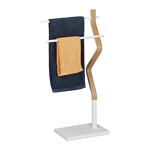 Relaxdays Portatoallas de Pie Zigzag, Toallero 2 Barras, Toallas Mano y Paños Cocina, Madera y Metal, Blanco y Natural